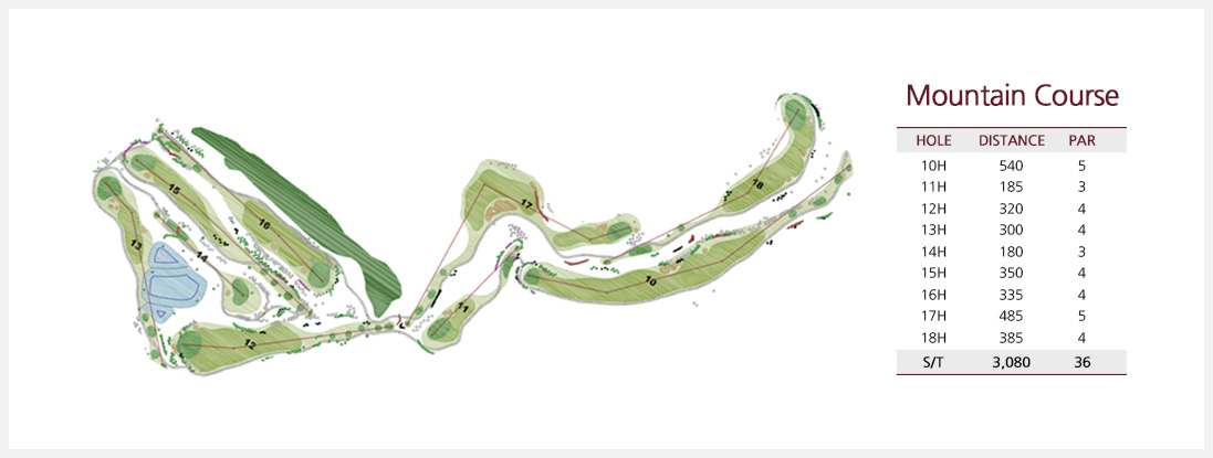 기억성코스내 살아 있는 원시림 대나무숲의 보존을 통해 자연 친화적인 코스지형 및 지질 특성을 강조한 독특한 디자인, 암석 노출의 묘미를 살린 감각적인 천연수로를 이용한 계류와 폰드의 조성으로 품격있는 자연미를 살린 미학적 코스설계